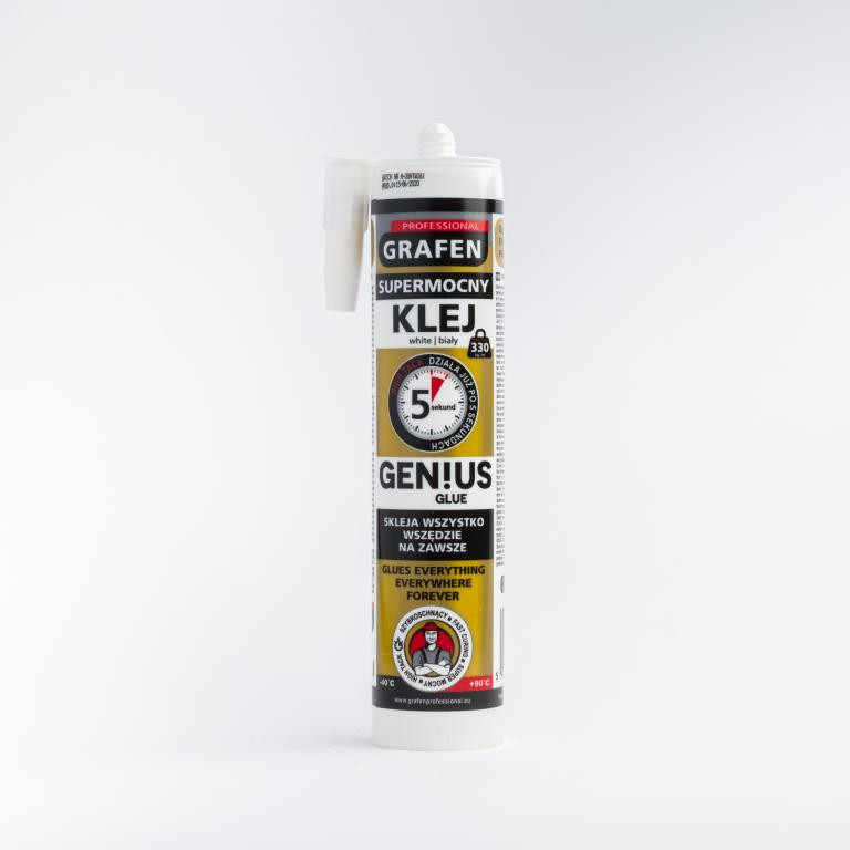 Grafen Genius ragasztó egy egykomponensű, sokoldalú hibrid ragasztó, amelyet nagyon nagy előkötési szilárdság jellemez (már 5 másodperc alatt tart, akár 330 kg / m2 erővel). Kiváló tapadás minden építési aljzathoz. Szagtalan, nem tartalmaz oldószereket, izocianátokat és szilikonokat. Ellenáll számos vegyi anyagnak. Nagyon széles hőmérséklet-tartományban tartós -40 ° C és + 90 ° C közötti edzés után. A rugalmas, sűrű konzisztencia ideálisan illeszkedik a kombinált anyagokban fellépő feszültségekhez. A kiváló előtapadás lehetővé teszi a ragasztott elemek támogatása nélküli rögzítést. Az edzés utáni kötés festhető (víz alapú festékekkel is). A csatlakozás tartós, teljesen ellenáll a változó időjárási viszonyoknak.